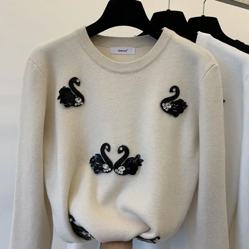 Autumn Winter Round Collar Sweater Women s New Fashion Swan Sequins Bead Knitting Pullovers Sweater Girls Basic Shirt Tops Coat
