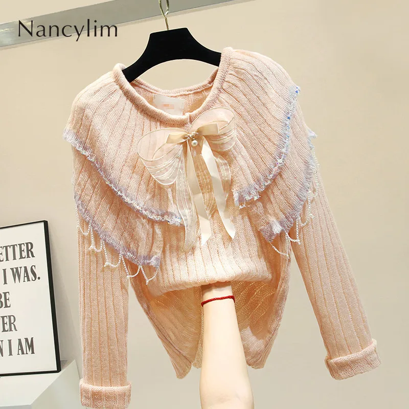 Sweet Sweater for Women Long Sleeve Pullover Layer Lotus Collar Knitted Sweater Girls Ladies Fall Winter Loose Pull Coat Femme