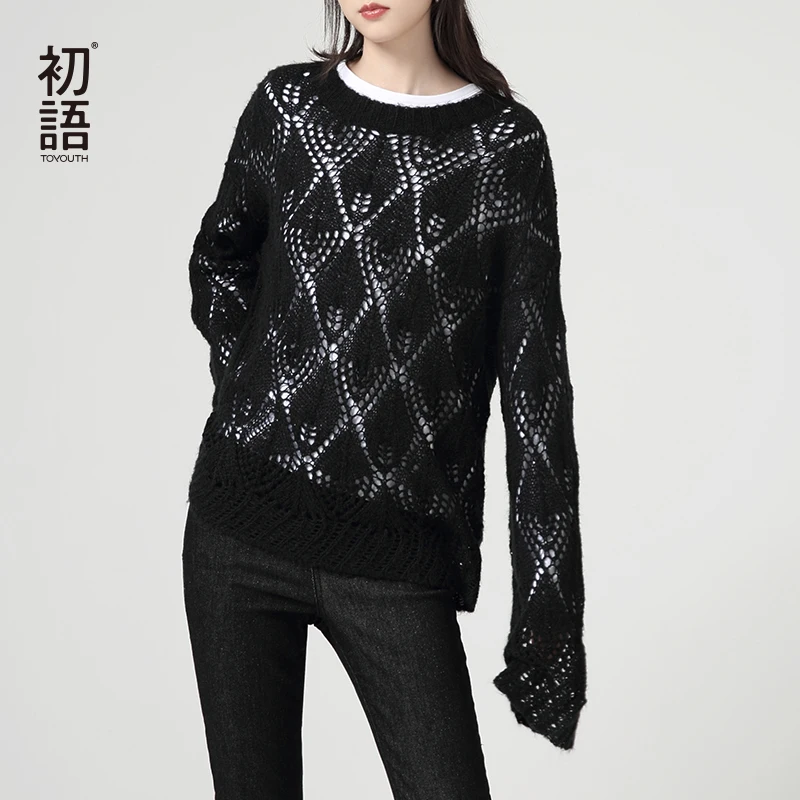 Toyouth Autumn New Hollow Out Long Sleeve O neck Knitted Pullover Korean Style Women Casual Sweater
